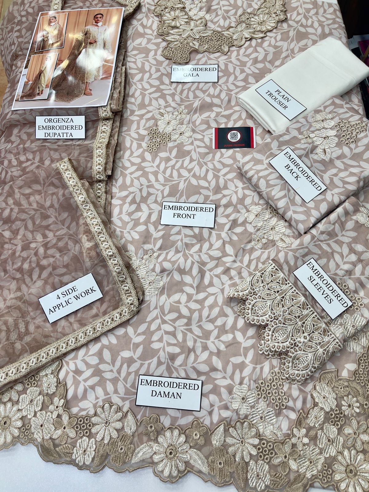 EID COLLECTION CHIKENKARI (3PEC-UNSTICHED)* QUALITY U LOVE TO WEAR DIGITAL PRINTED SWISS LAWN SHIRT WITH ORGENZA DUPATTA DESCRIPTION -DIGITAL PRINTED FRONT WITH HEAVY CHIKENKARI EMBROIDEREY ALONG WITH HEAVY DAMAN EXTERNAL PATCH -HEAVY EMBROIDERED DAMAN PATCH -DIGITAL PRINTED FRONT WITH HEAVY CHIKENKARI EMBROIDEREY -DIGITAL PRINTED SLEEVES WITH HEAVY CHIKENKARI EMBROIDEREY ON FABRIC ALONG WITH HEAVY EMBROIDERED CUFF PATCH -DIGITAL PRINTED ORGENZA DUPATTA WITH 4 SIDE APPLIC EMBROIDERED(READY TO WEAR) -COTTTON DYED TROUSER